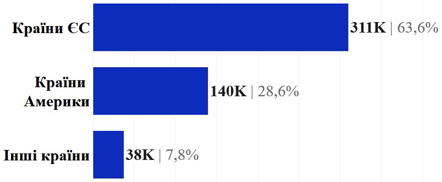 Абсолютна більшість старих автомобілів було придбано, як не дивно, в країнах Євросоюзу. Саме звідти з січня по жовтень 2021 року українці привезли 311 тисяч легкових авто з пробігом — 63,6% від загального числа.