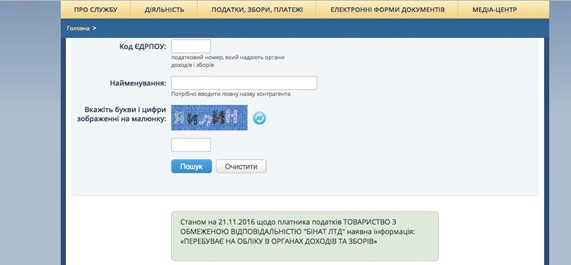 Дальше переходим на сайт Государственной фискальной службы Украины () чтобы получить информацию о налоговом статусе. В нашем случае мы видим, что ООО «БИНАТ ЛТД» пребывает на учете в органах ГФС и по состоянию на текущую дату у него отсутствует налоговый долг.