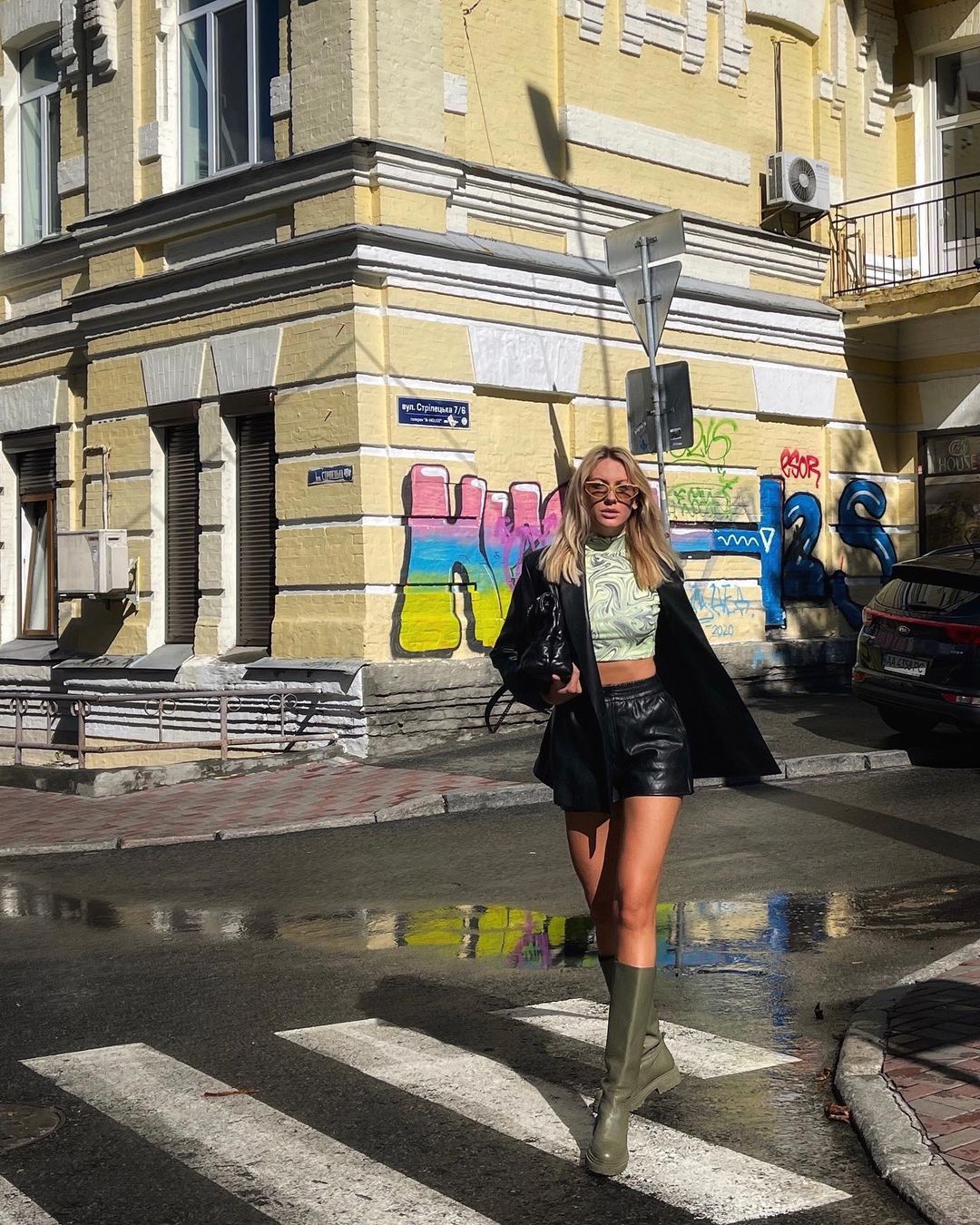 Леся прогулялась после дождя по Киеву в смелом и соблазнительном образе. Для прменада по центру она выбрала кожаные шорты, черный пиджак оверсайз, топ с абстрактным принтом и трендовые грубые сапоги оливкового оттенка. Она захватила с собой удобную вместительную стеганую сумку а глаза скрыла за солнечными очками в модной оправе.