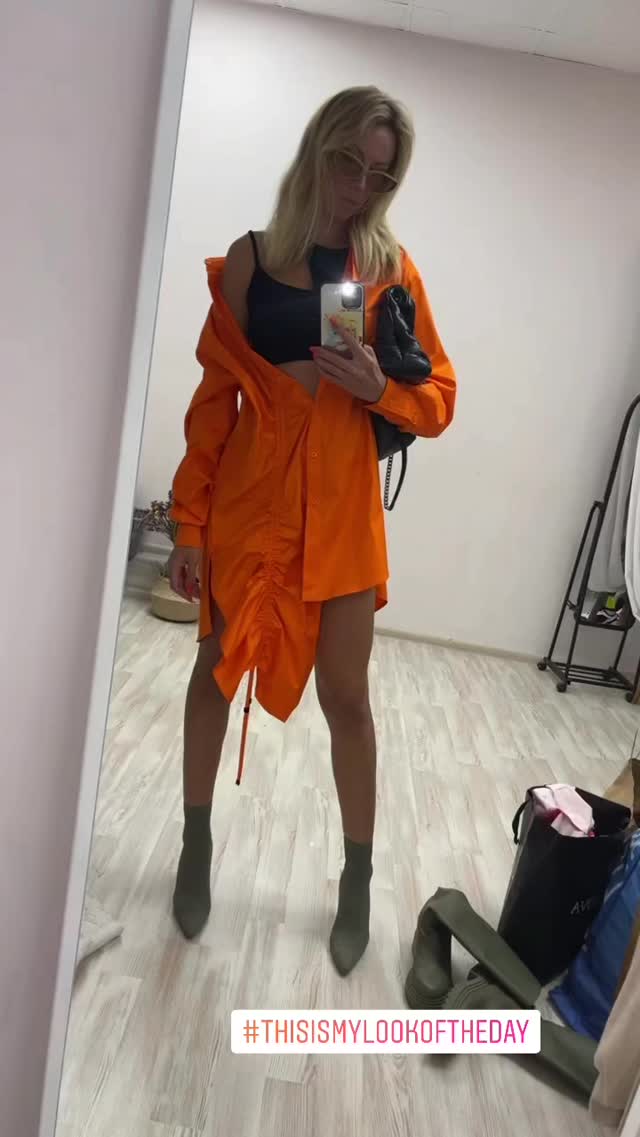 Она успела продемонстрировать поклонникам необычный образ дня - черный топ на тонких бретелях и оранжевое ассиметричное платье-рубашка. Второй лук звезды был куда более дерзким – латексный корсет с плотными чашечками и облегающие лосины, повторяющие в точности изгибы тела стройной Леси.