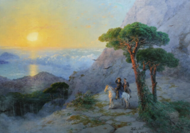 Например, посмотрите на работу «Пушкин на вершине Ай-Петри при восходе солнца». Нашли поэта? Ну да, он один из тех двух всадников в углу картины. Который? Возьмите лупу!