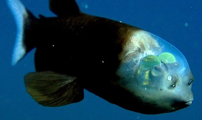 В заливе Монтерей в Калифорнии засняли причудливую рыбу с прозрачным лбом и огромными зелеными шарообразными глазами в толще тела, которые смотрят с