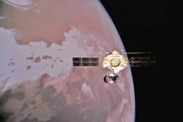 Китай опублікував нові фото Марса, зроблені зондом "Тяньвень-1". На кадрах можна побачити сам орбітальний апарат, поверхню Червоної планети, яка складається з сухого і водяного льоду, і марсохід "Чжуронг".