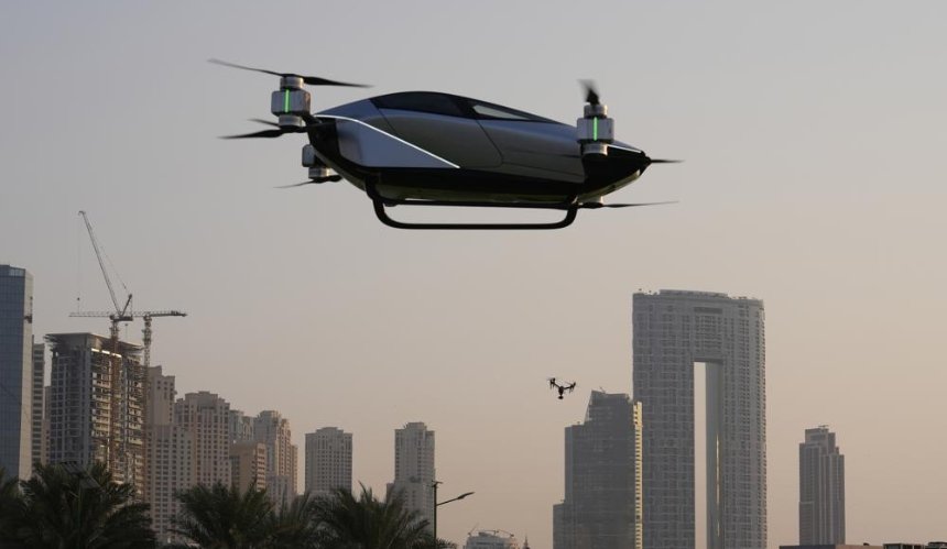 В ОАЕ в понеділок китайська фірма випробувала електричне літаюче таксі, яке колись зможе перевозити людей містами.